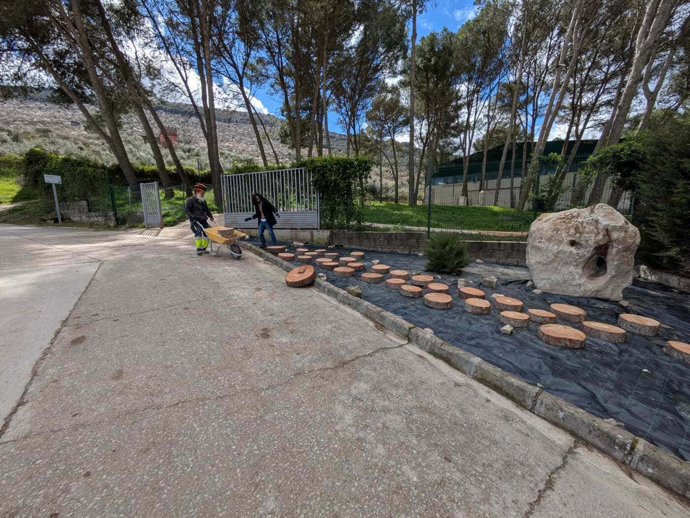En este proyecto se han realizado utilizando madera procedente de Pinus halepensis caídos durante temporales recientes, reutilizando este recurso natural y otorgándole un nuevo valor dentro del jardín.